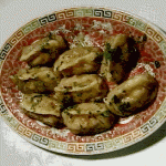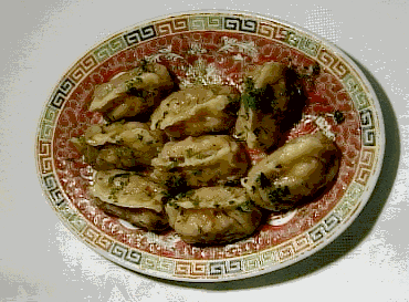 Mięso wymieszać z solą, sosem sojowym i mąką ziemniaczaną, mieszać w jedną stronę 30 sek, dodać pozostałe składniki, mieszać w dalszym ciągu w jednym kierunku aż powstanie jednolita masa. Wstawić do lodówki na 45-60 min. Zagnieść ciasto jak na pierogi smażone. Ciasto podzielić na 2 części, jedną przykryć zwilżoną ściereczką, drugą rozwałkować, szklanką wykroić krążki. Farsz nakładać na krążki, nie przykrywając nadzienia złożyć dwa boki pozostałe boki mocno zlepić. Pierogi będą miały kształt torebeczki. Ulepione pierogi trzymać pod suchą ściereczką na desce posypanej mąką. Przygotować 2 szklanki zimnej wody. Duży garnek osolonej wody doprowadzić do wrzenia, włożyć pierogi, zagotować, wlać szklankę wody, lekko zamieszać, zagotować, wlać drugą szklankę zimnej wody, doprowadzić do zagotowania. Pierogi wybrać łyżką cedzakową do dwóch cedzaków, osączyć. Podawać z sosem sojowym, octem chińskim lub sosem.