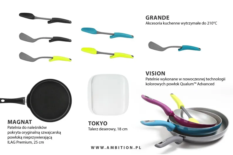i funkcjonalność produktów marki znajdują się garnki i patelnie, zastawy i szkło stołowe, sztućce oraz akcesoria kuchenne. Niebanalne, zawsze podążające za duchem czasów wzornictwo, profesjonalna trwałość oraz wyjątkowo duży wybór to najmocniejsze strony każdej kolekcji AMBITION / www.ambition.pl