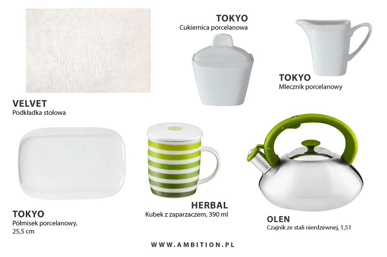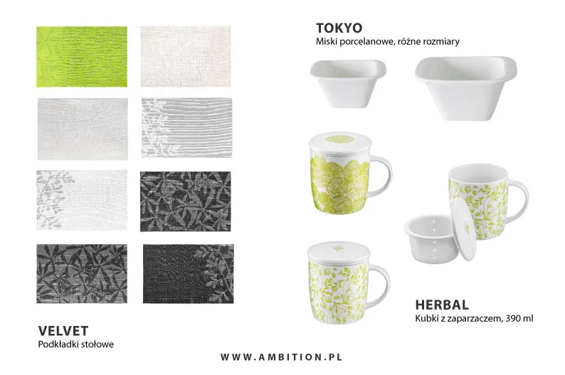 W kolekcji AMBITION na uwagę zasługuje bogata kolekcja podkładek stołowych Velvet. Utrzymane w nowoczesnych kolorach intensywnej zieleni i doskonale komponujących się z nią odcieniach kremu i szarości, będą stanowić doskonałą oprawę dla nowych kubków z linii Herbal. Kubki wyposażone są w sitko do zaparzania oraz pokrywkę pozwalającą zachować temperaturę parzonej kawy, herbaty czy ziół. Podkładki Velvet w tym sezonie wystąpią dekorowane motywem gałązek, liści i drzewa.